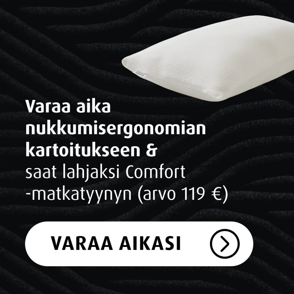 Kartoituksen aikana saat tietoiskun nukkumisergonomiasta ja tunnistat kehittämiskohteita omassa nukkumisergonomiassasi asiantuntijan avustuksella.